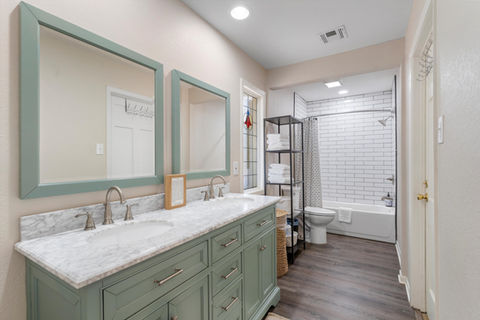 Nestled among 30 acres is this 5 bedroom, 5 bathroom modern rustic home. Within the 4,000 sq ft, the Gathering House includes a full kitchen with a huge butcher block island and opens into the great room, dining area, and patio. The 41 ft enclosed patio features solid windows that frame the serenity of the property with sky-high live oaks and a refreshing pool. The Gathering House can accommodate catered seated dinners for up to 75 guests.